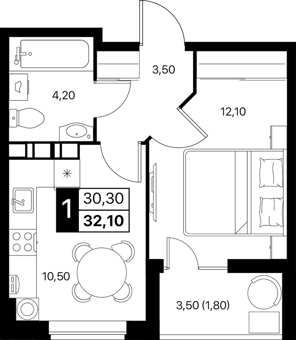 1-комнатная — 32,1 м² 3/12 эт. в Квартал впечатлений Эстет