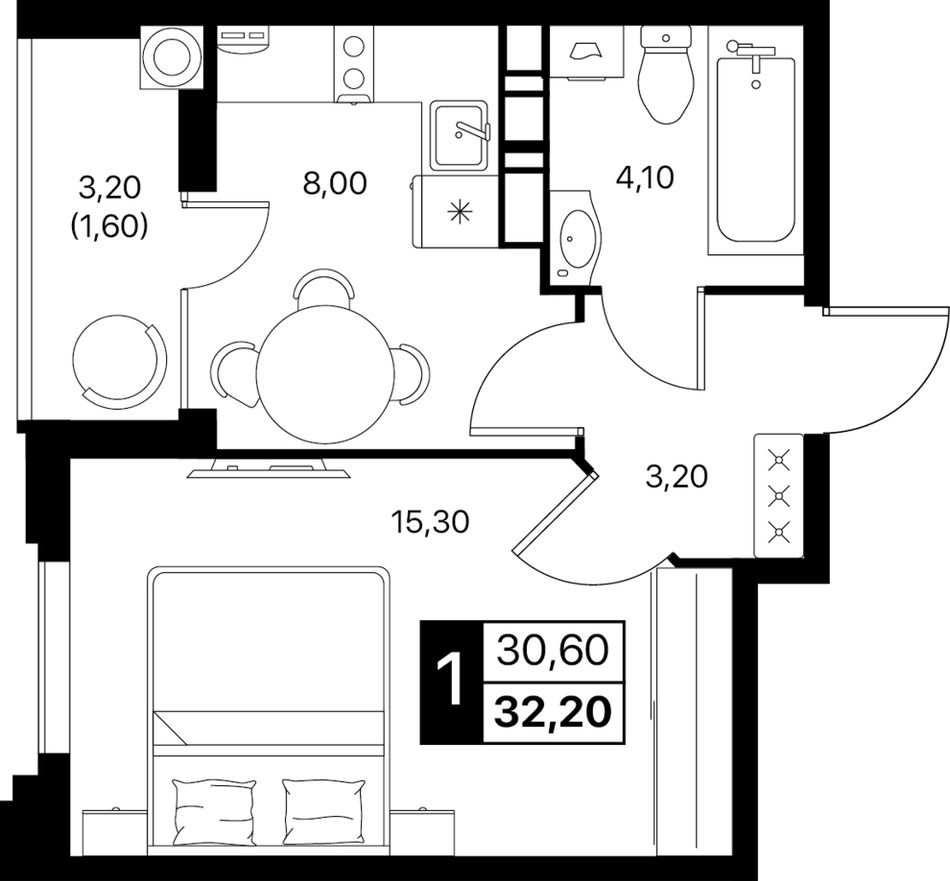 1-комнатная — 32,2 м² 4/12 эт. в Квартал впечатлений Эстет