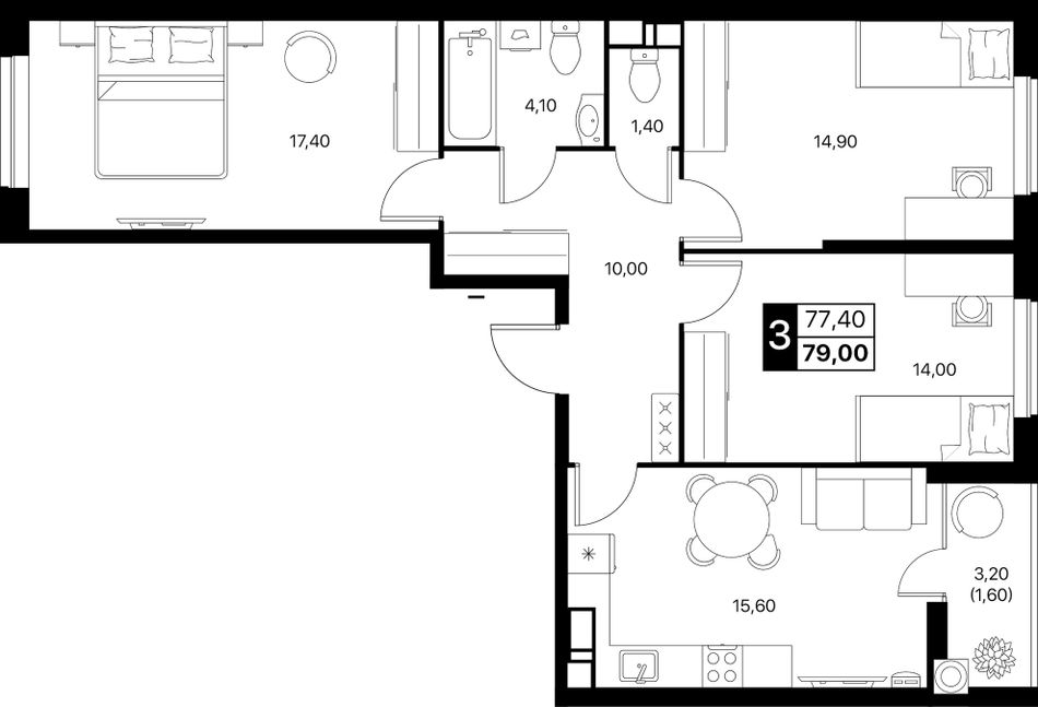 3-комнатная — 79 м² 6/12 эт. в Квартал впечатлений Эстет