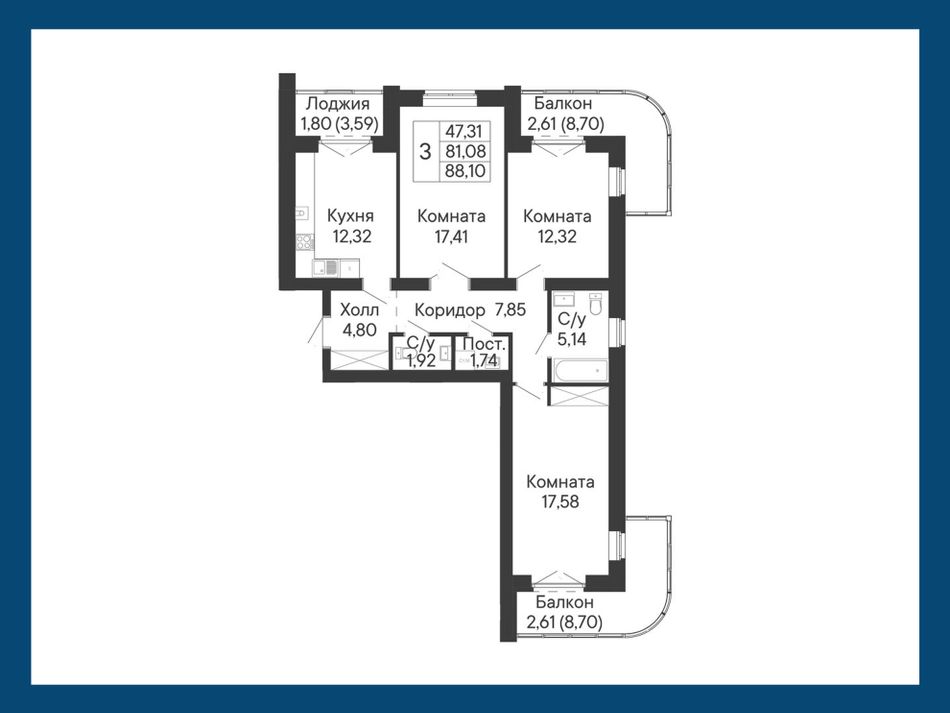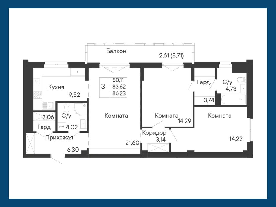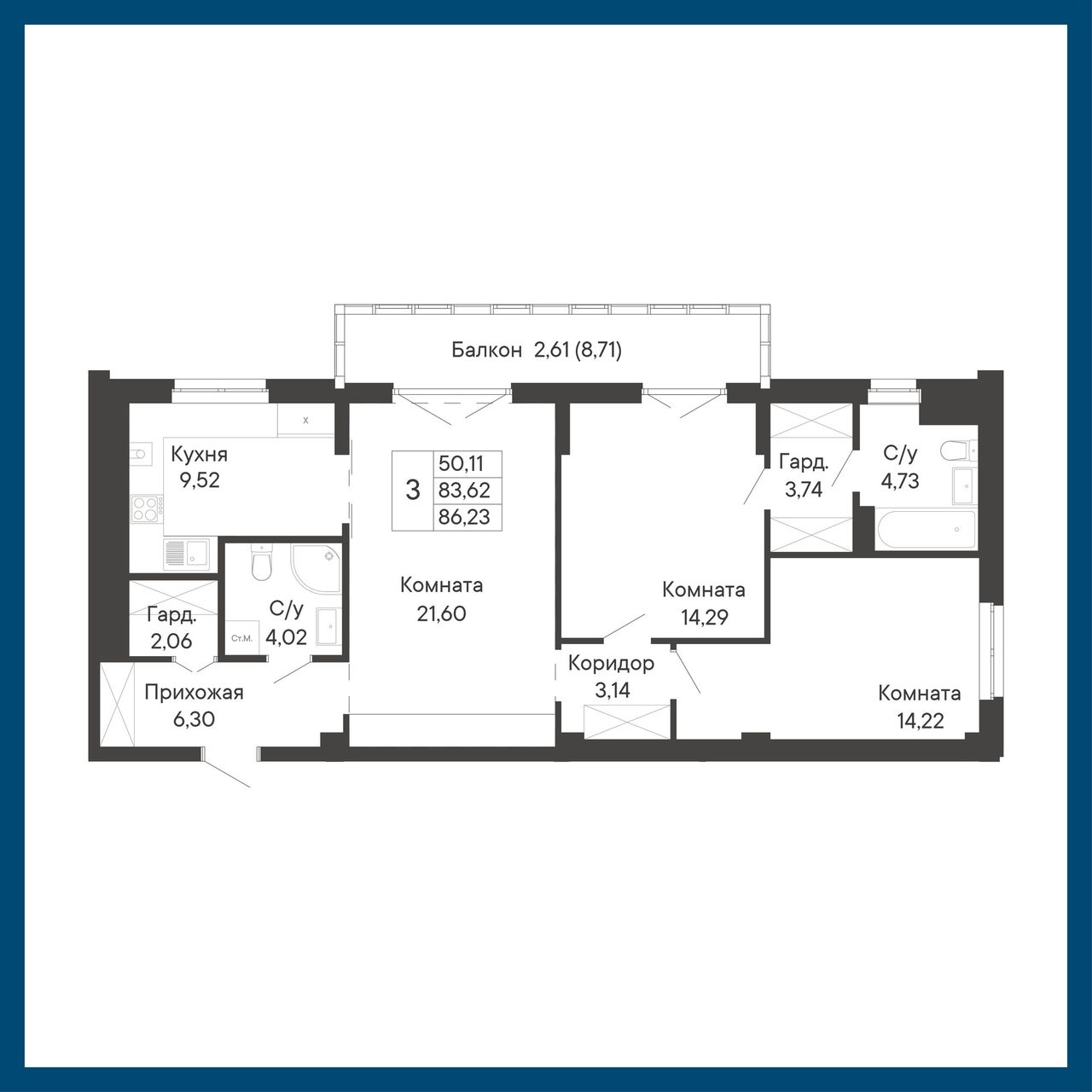 3-комнатная — 86,23 м² 2/8 эт. в Ривьера