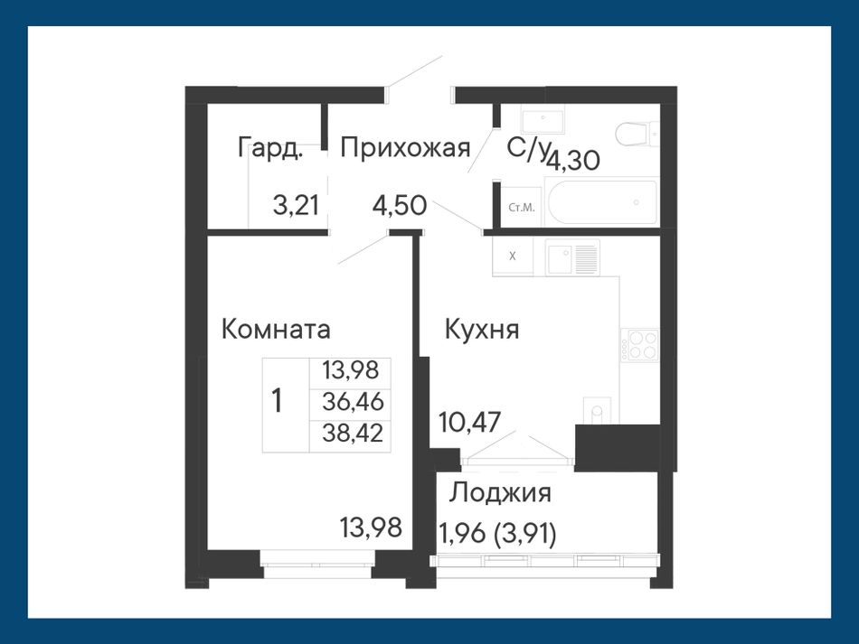 1-комнатная — 38,42 м² 2/8 эт. в Ривьера