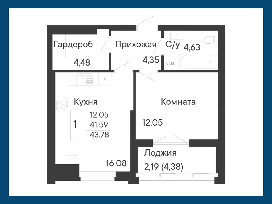 1-комнатная — 43,78 м² 4/8 эт. в Ривьера