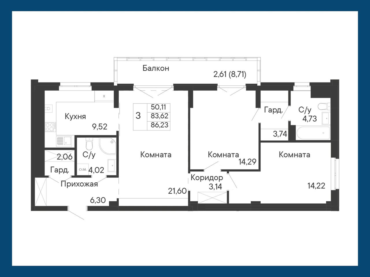 3-комнатная — 86,23 м² 7/8 эт. в Ривьера