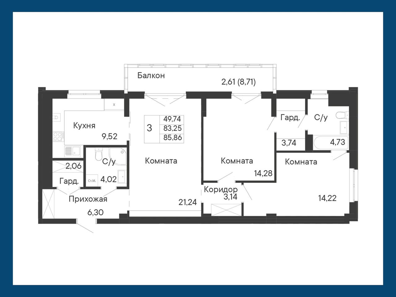 3-комнатная — 85,86 м² 8/8 эт. в Ривьера