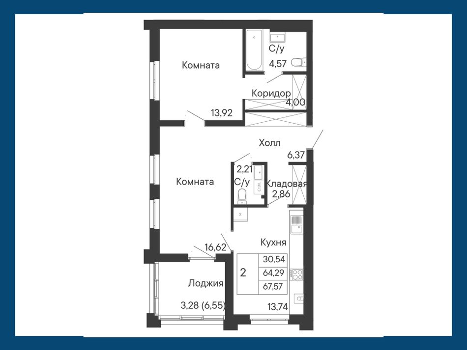 2-комнатная — 67,57 м² 3/8 эт. в Ривьера