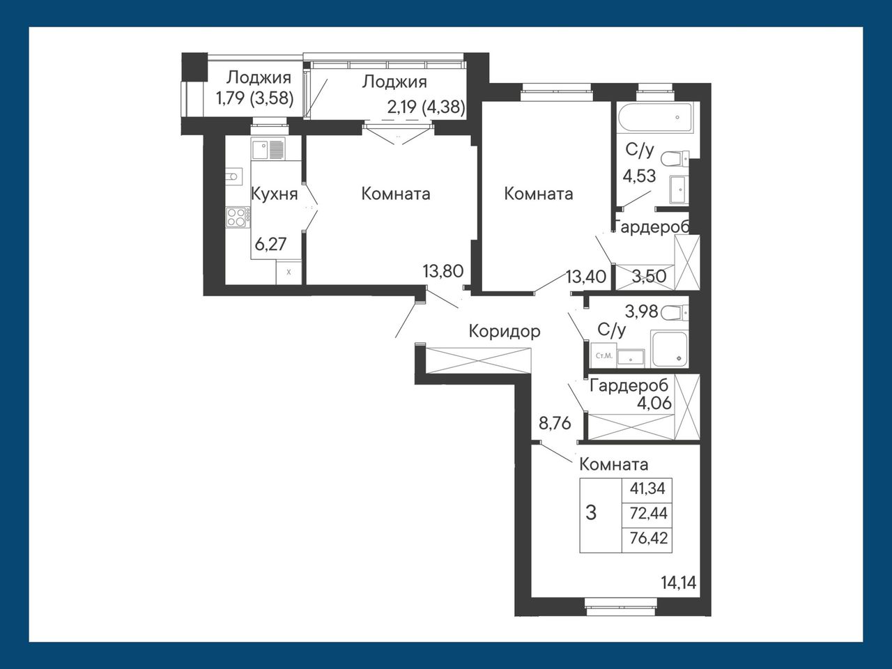3-комнатная — 76,42 м² 6/8 эт. в Ривьера