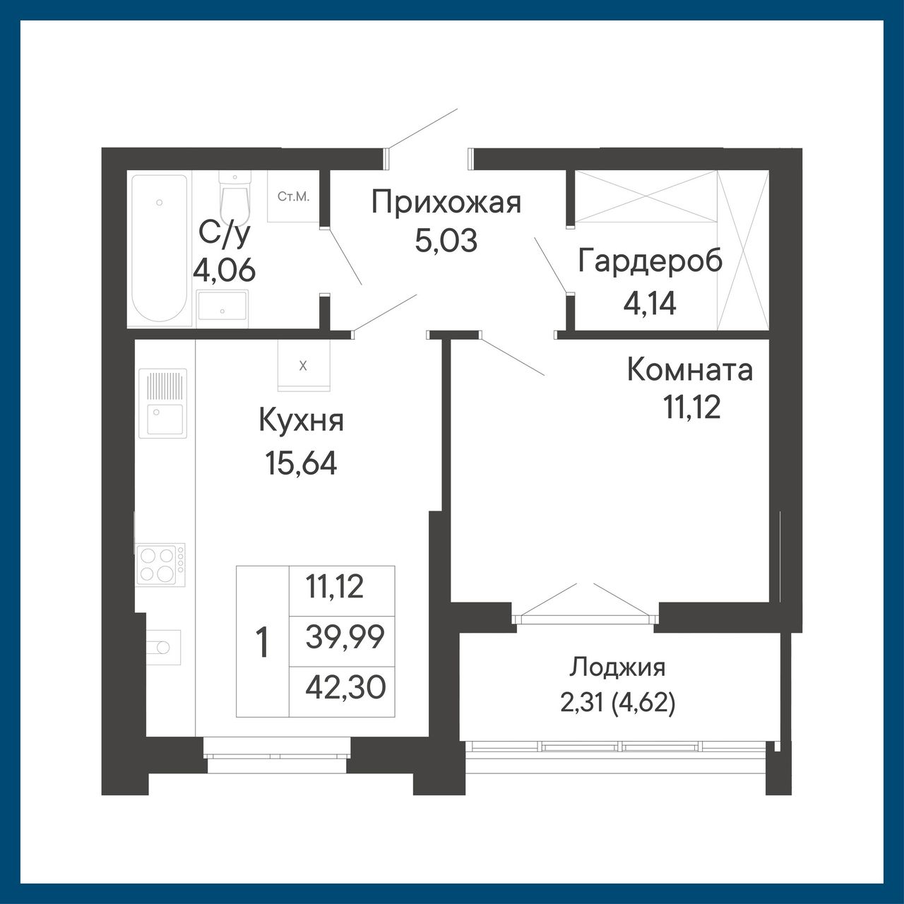 1-комнатная — 42,3 м² 6/8 эт. в Ривьера