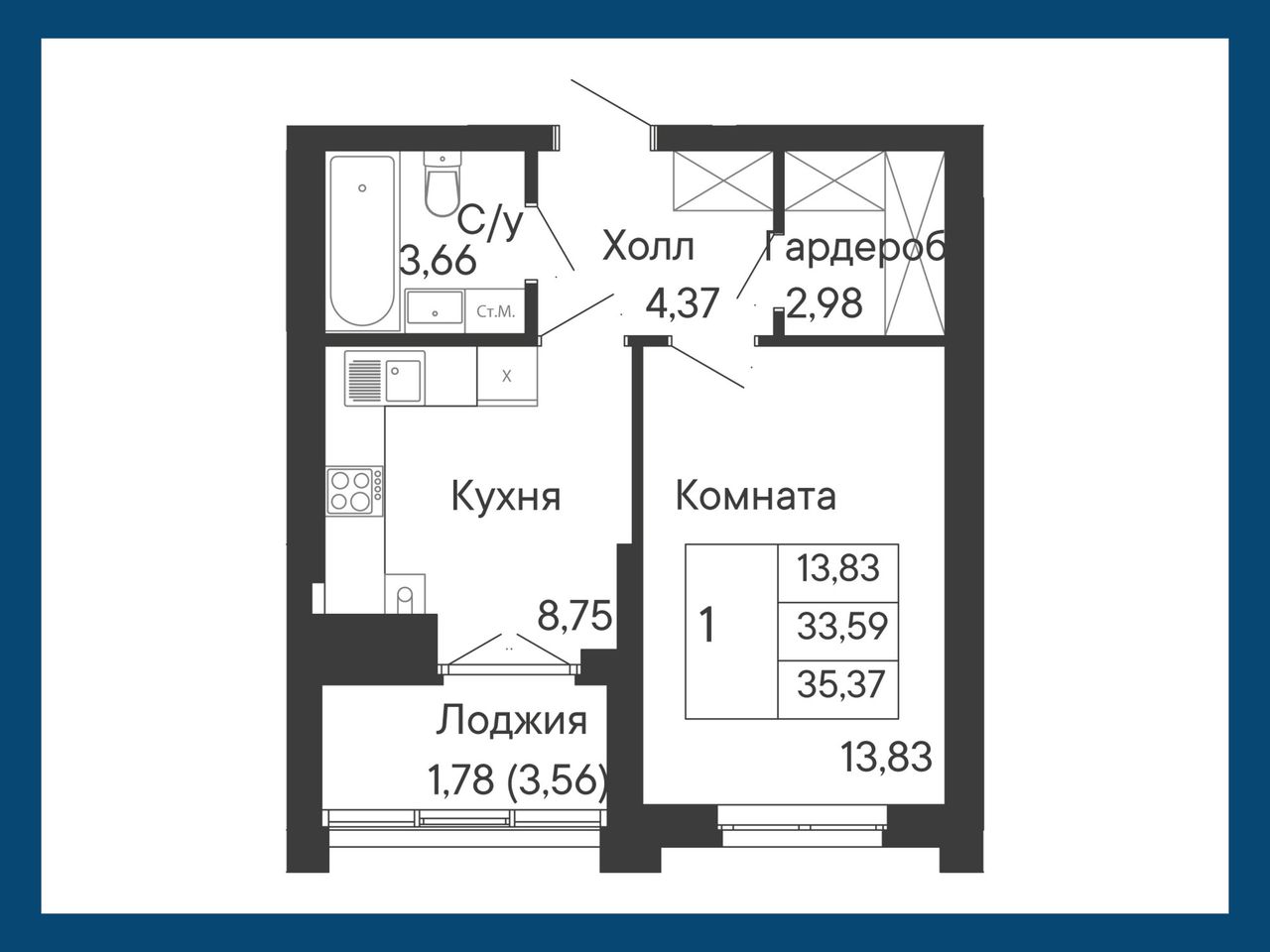 1-комнатная — 35,37 м² 7/8 эт. в Ривьера