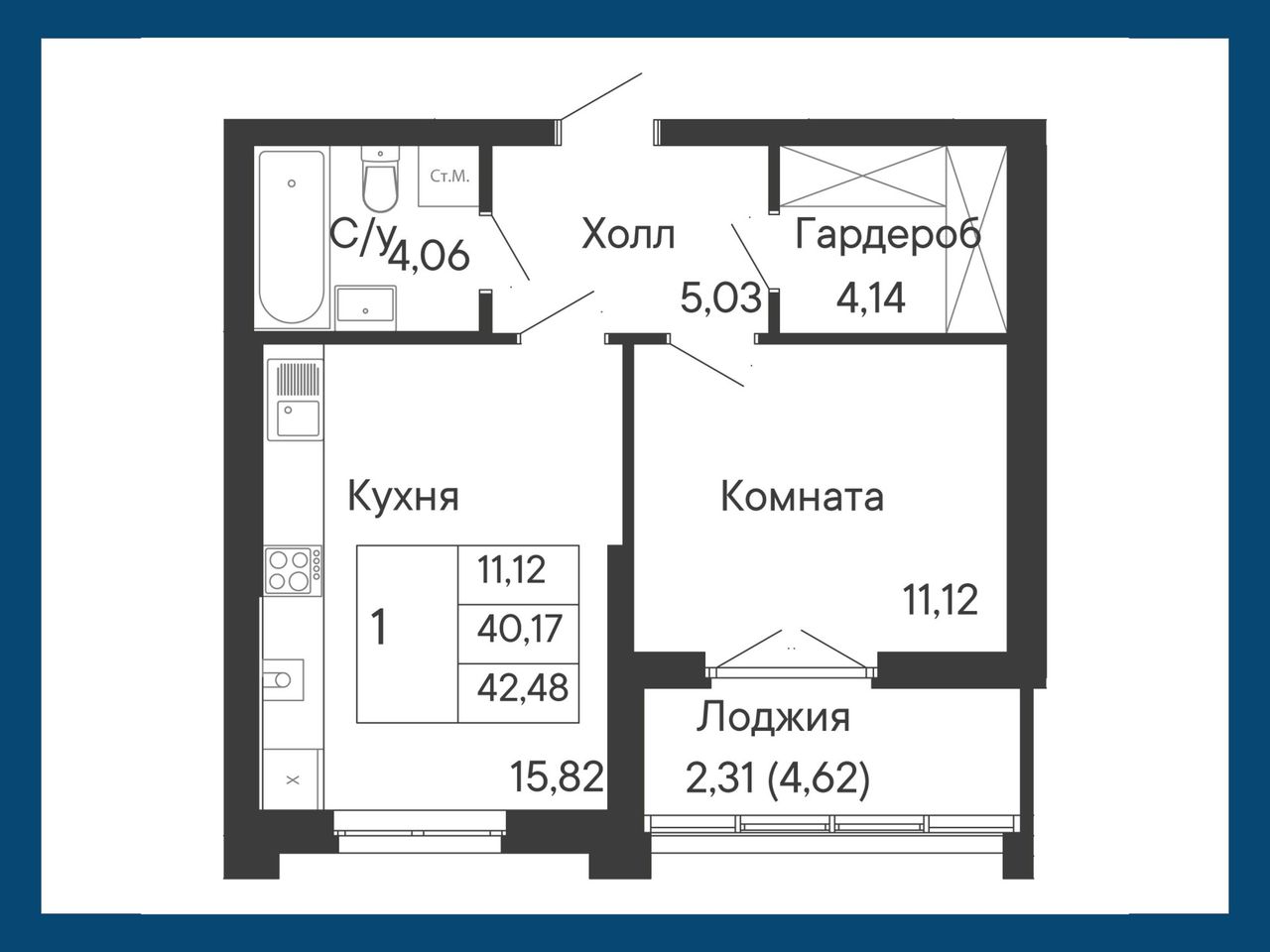 1-комнатная — 42,48 м² 7/8 эт. в Ривьера