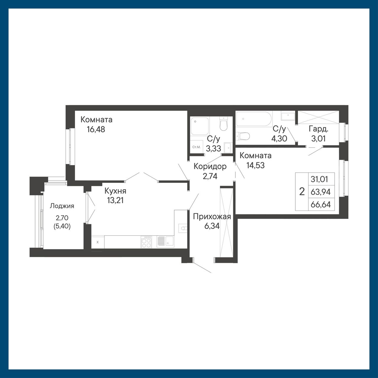 2-комнатная — 66,64 м² 7/8 эт. в Ривьера