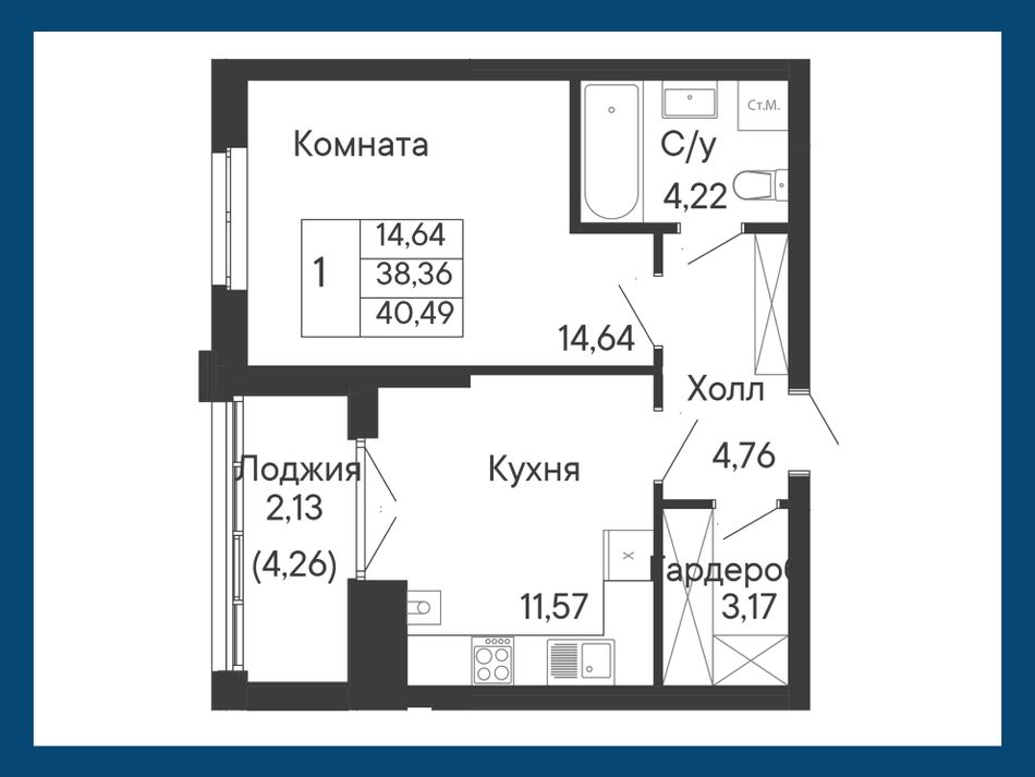 1-комнатная — 40,49 м² 2/8 эт. в Ривьера