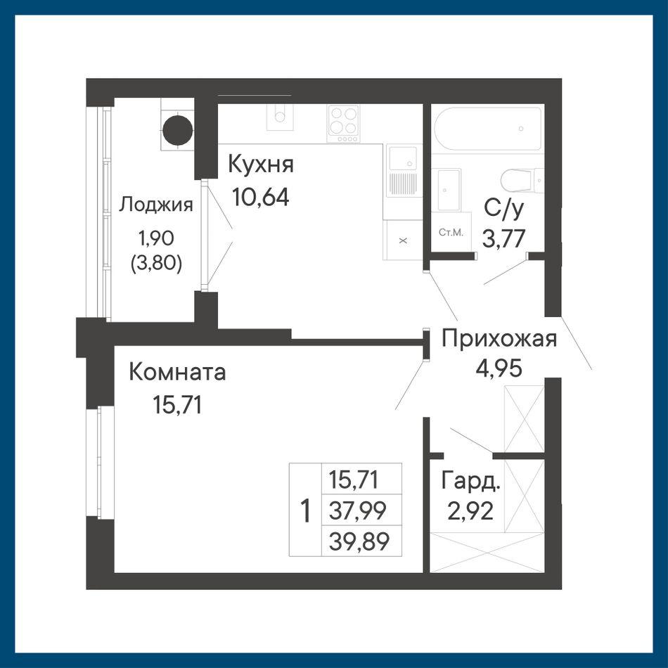 1-комнатная — 39,89 м² 2/8 эт. в Ривьера
