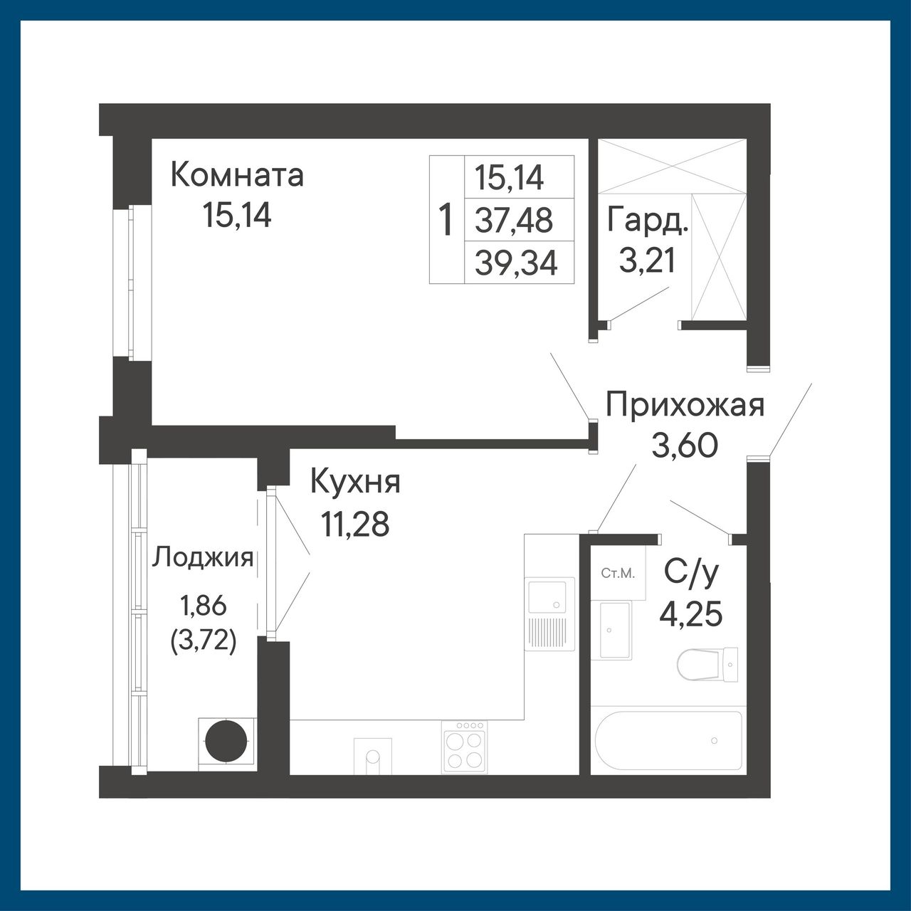 1-комнатная — 39,34 м² 2/8 эт. в Ривьера
