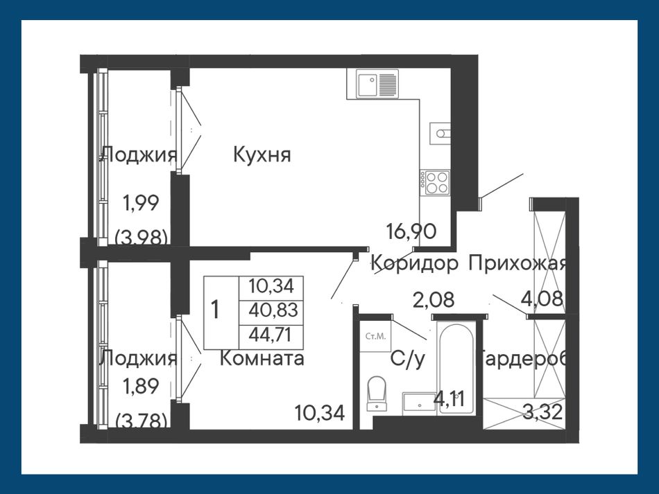 1-комнатная — 44,71 м² 3/8 эт. в Ривьера