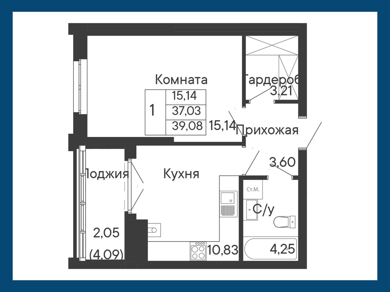 1-комнатная — 39,08 м² 3/8 эт. в Ривьера