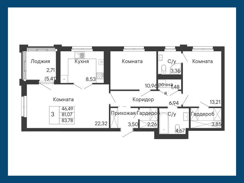 3-комнатная — 83,78 м² 3/8 эт. в Ривьера