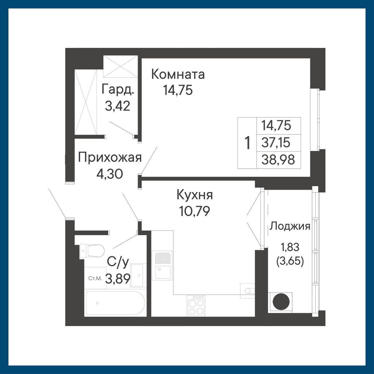 1-комнатная — 38,98 м² 4/8 эт. в Ривьера