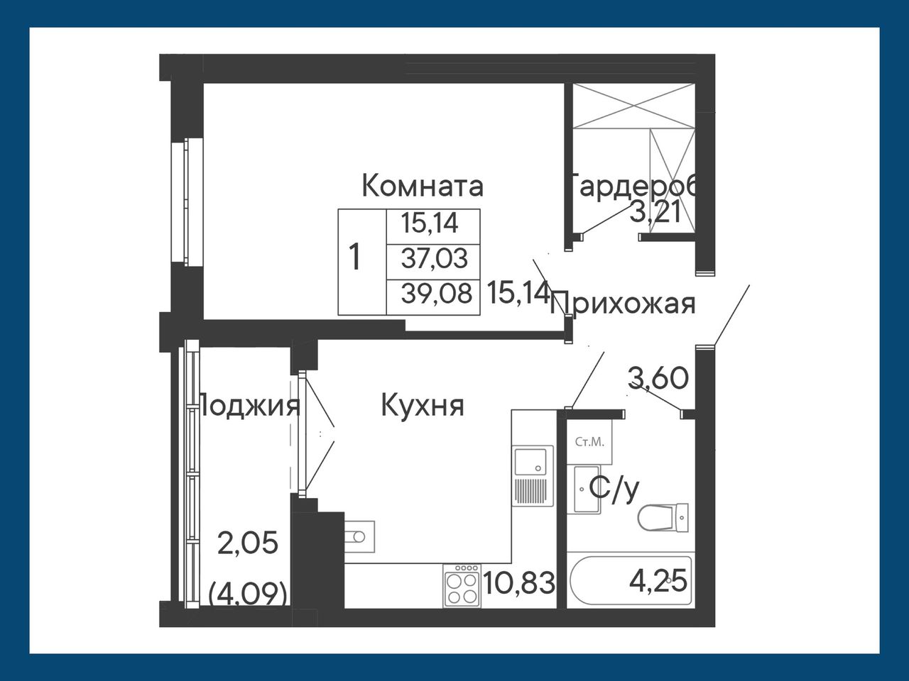 1-комнатная — 39,08 м² 5/8 эт. в Ривьера