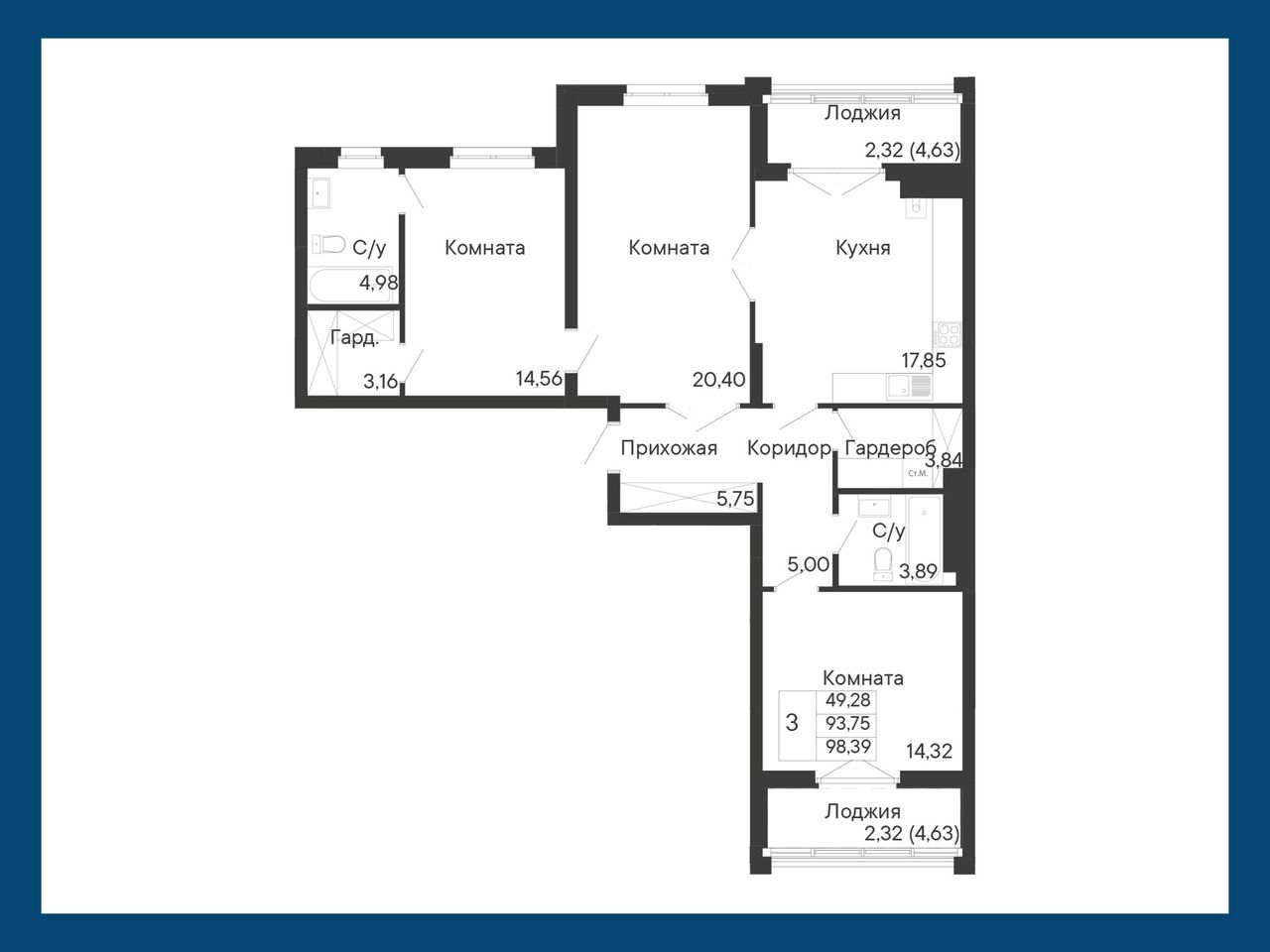 3-комнатная — 98,39 м² 2/8 эт. в Ривьера