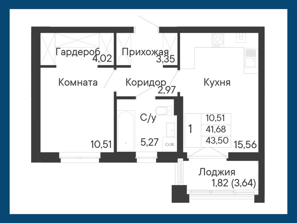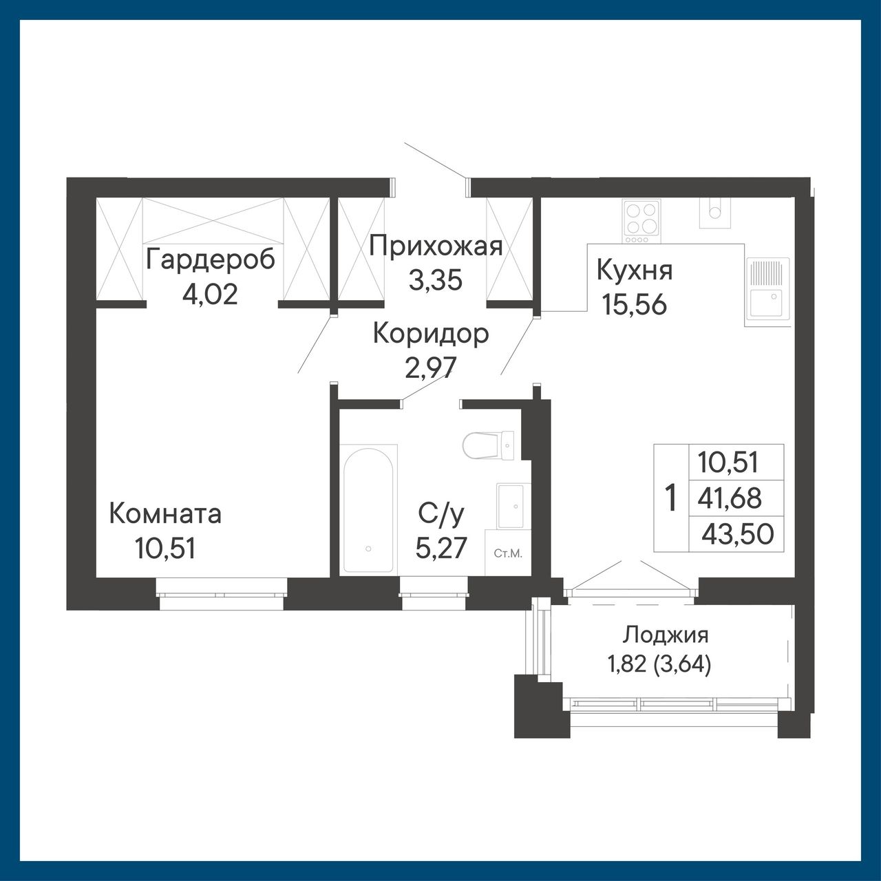 1-комнатная — 43,5 м² 4/8 эт. в Ривьера
