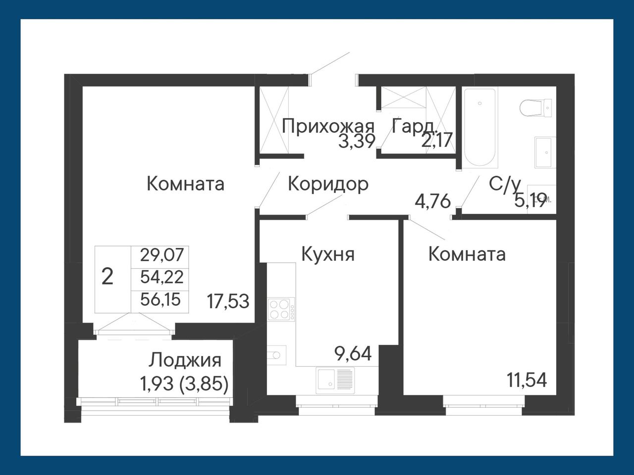 2-комнатная — 56,15 м² 8/8 эт. в Ривьера