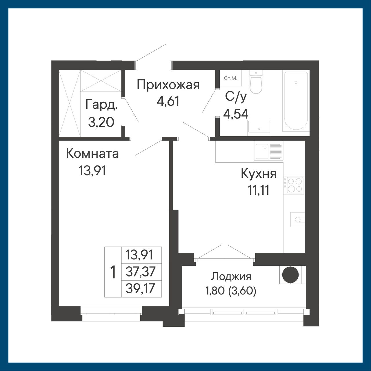 1-комнатная — 39,17 м² 3/8 эт. в Ривьера