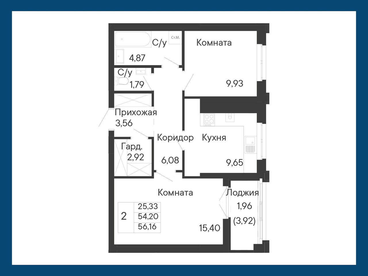 2-комнатная — 56,16 м² 2/8 эт. в Ривьера