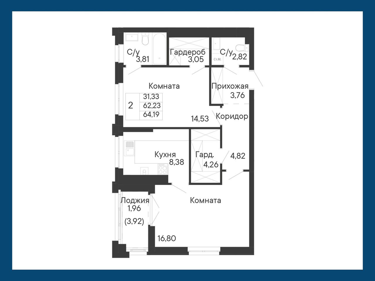 2-комнатная — 64,19 м² 3/8 эт. в Ривьера