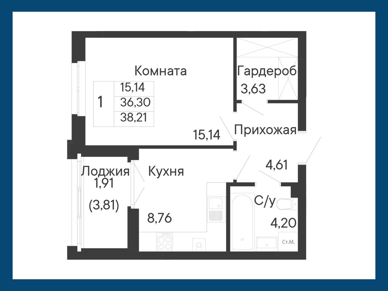 1-комнатная — 38,21 м² 3/8 эт. в Ривьера