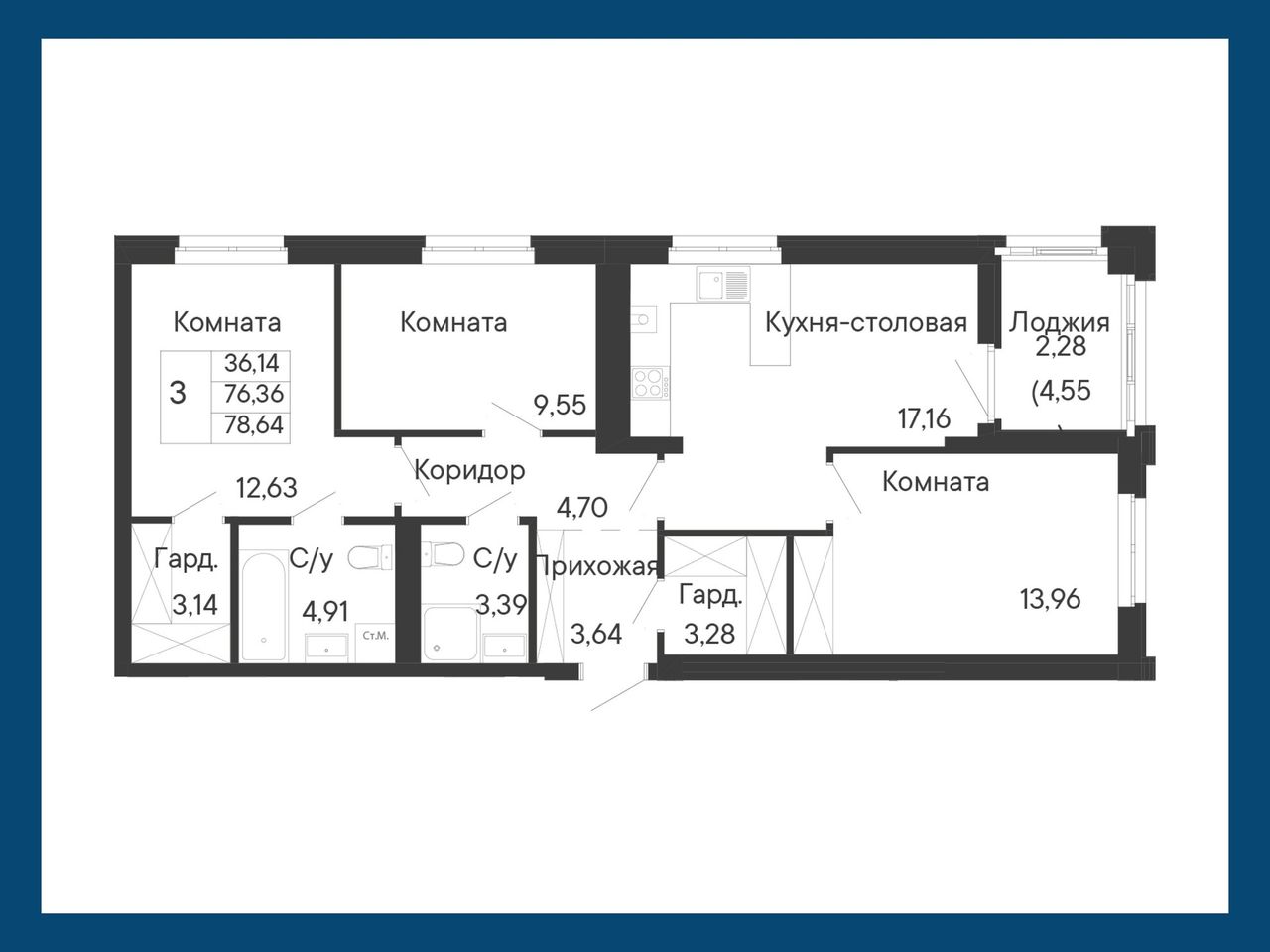 3-комнатная — 78,64 м² 4/8 эт. в Ривьера