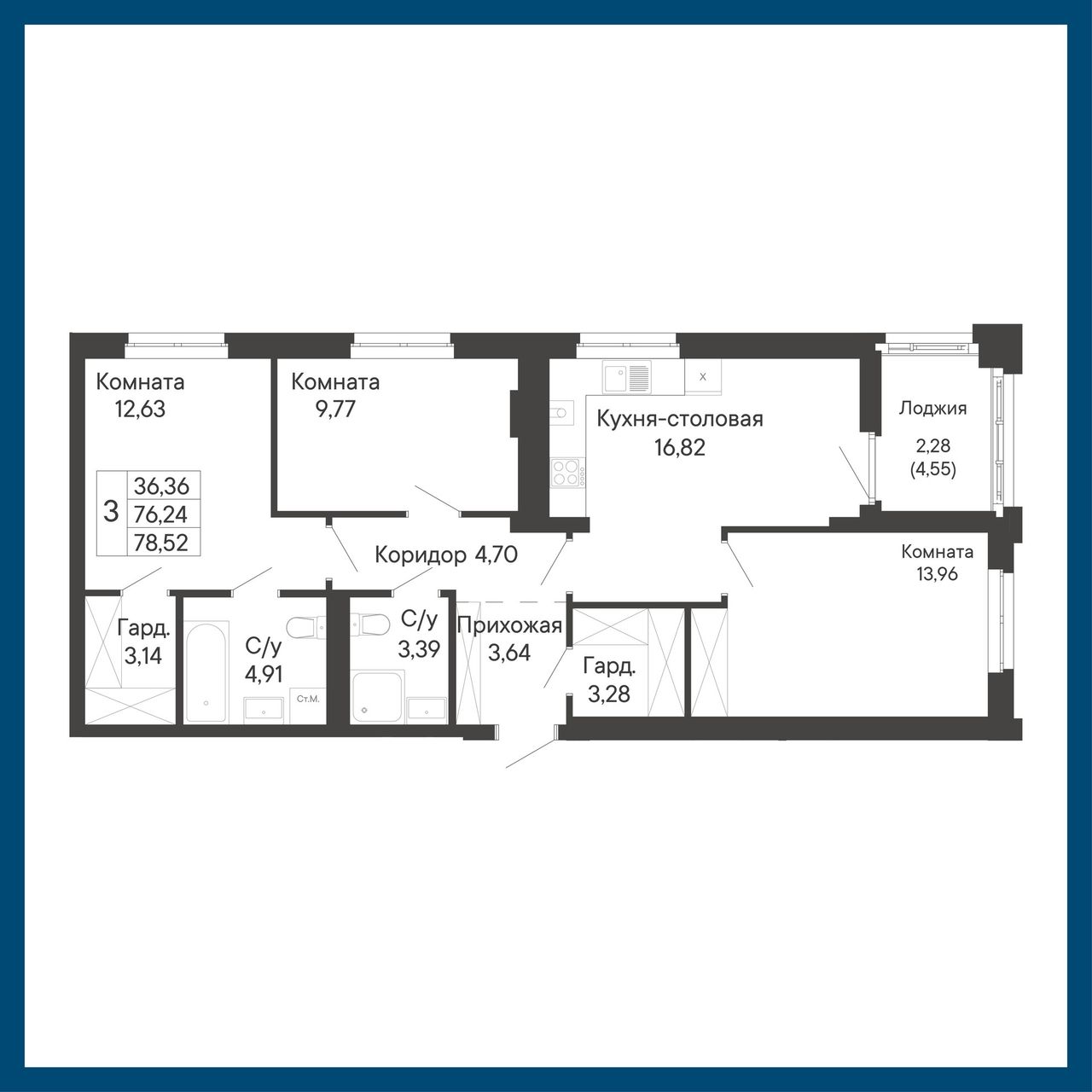 3-комнатная — 78,52 м² 5/8 эт. в Ривьера