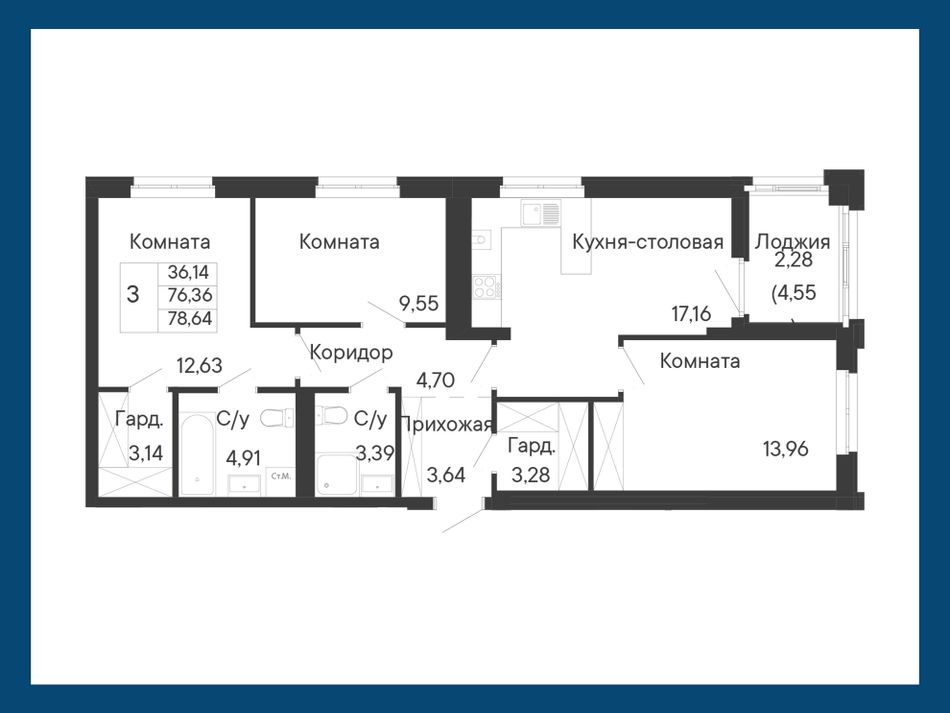 3-комнатная — 78,64 м² 6/8 эт. в Ривьера