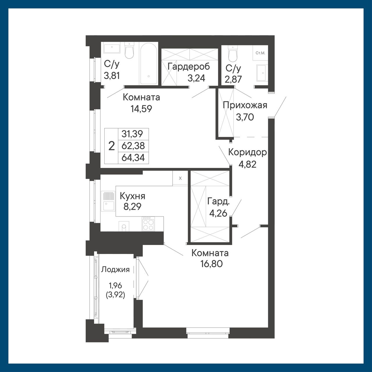 2-комнатная — 64,34 м² 6/8 эт. в Ривьера