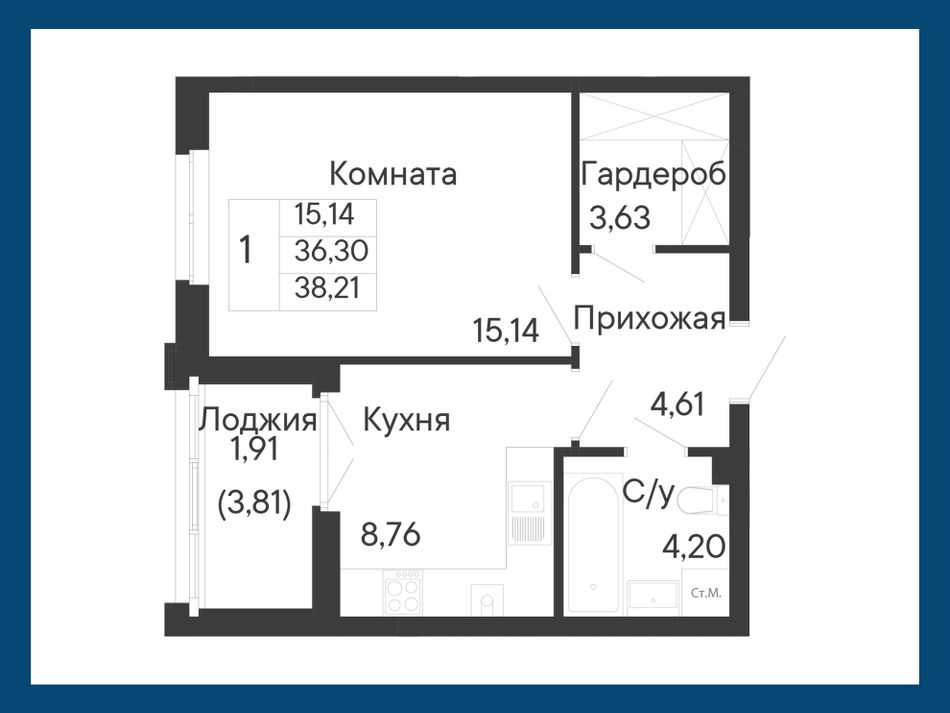 1-комнатная — 38,21 м² 6/8 эт. в Ривьера