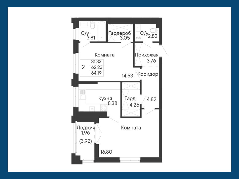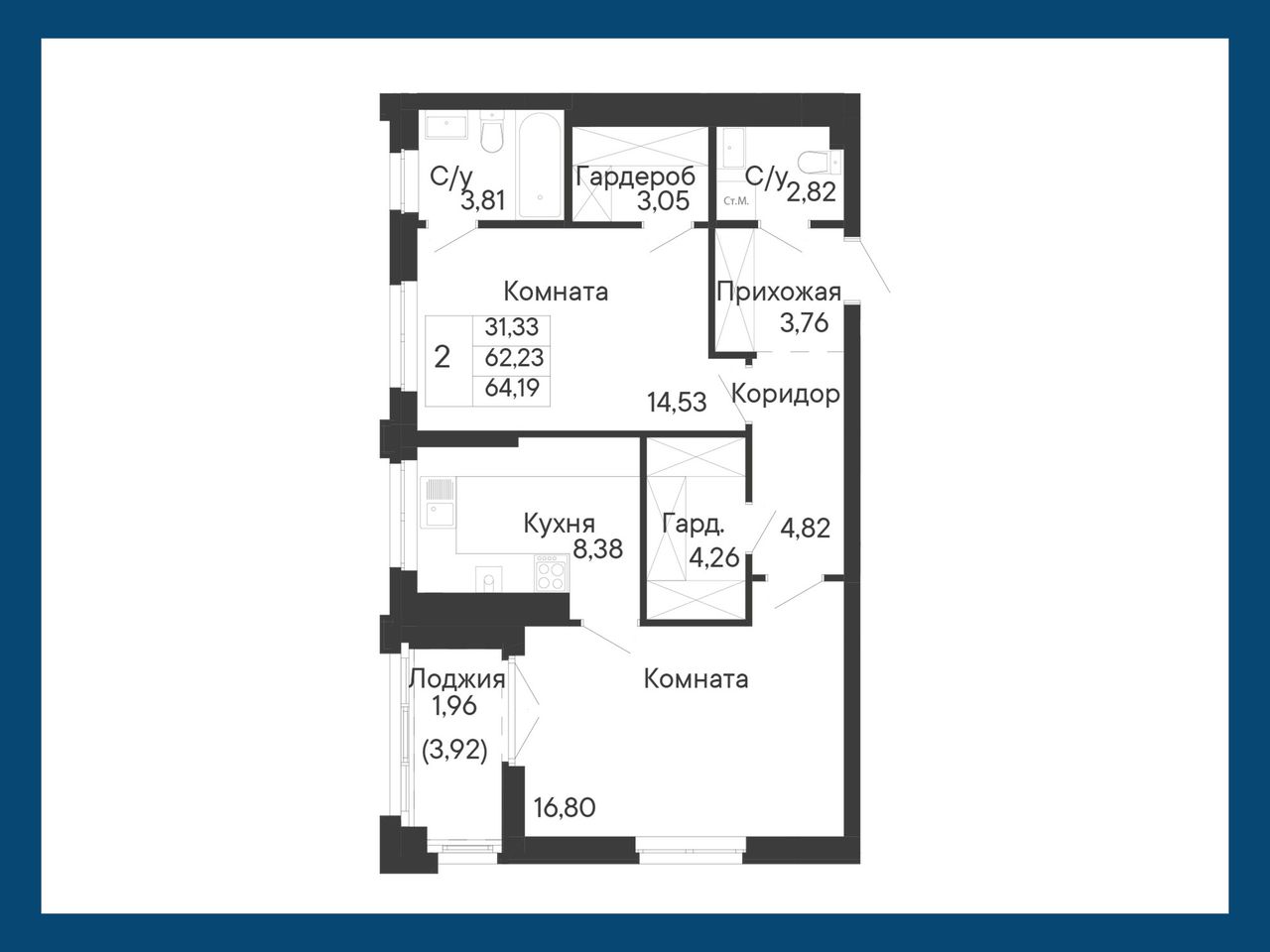 2-комнатная — 64,19 м² 7/8 эт. в Ривьера