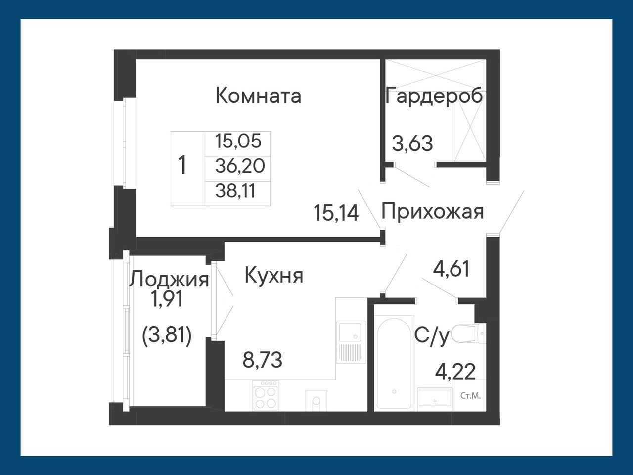 Общая площадь38,11 м²