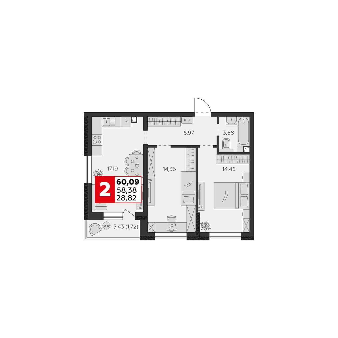 3-комнатная — 58,38 м² 2/9 эт. в К24