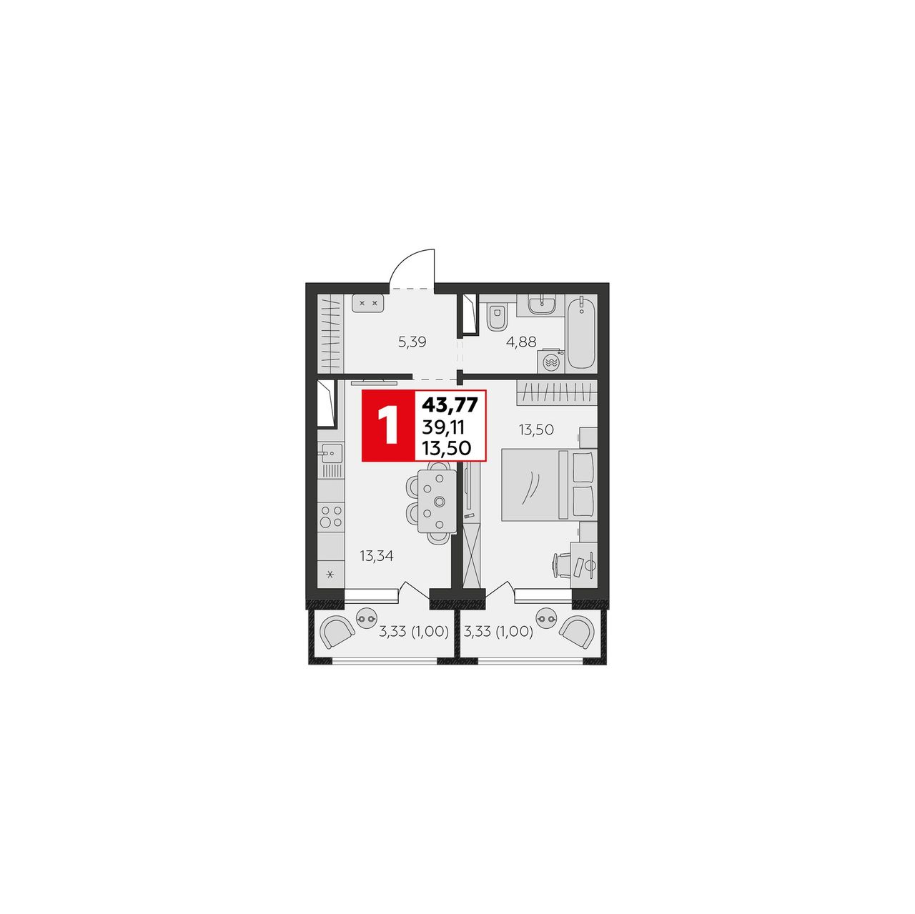 1-комнатная — 39,11 м² 7/9 эт. в К24