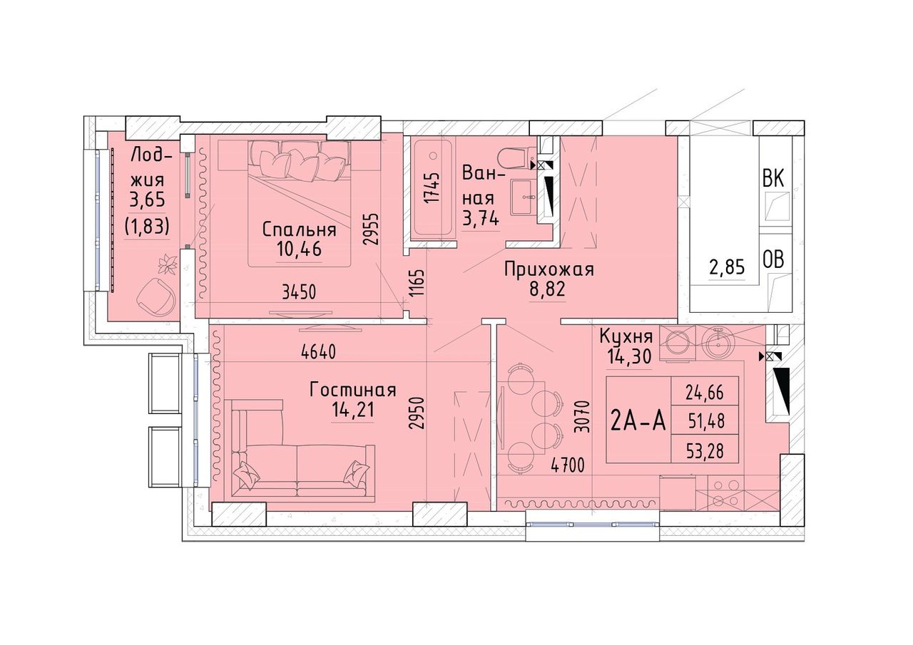 Общая площадь53,51 м²