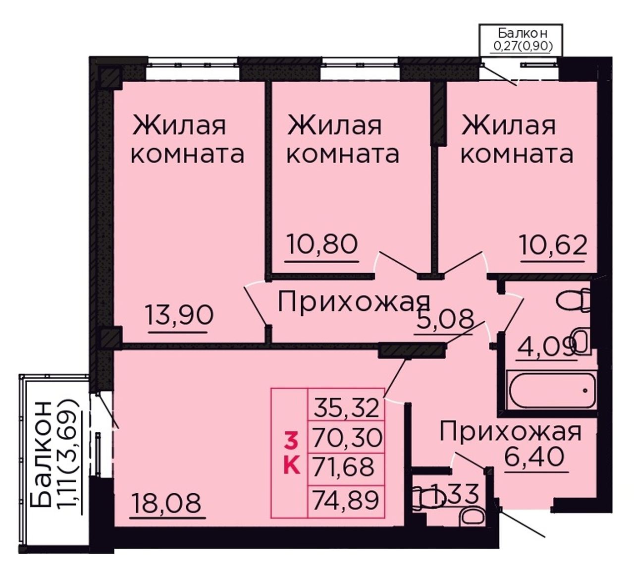 3-комнатная — 71,68 м² 7/9 эт. в Вишнёвый сад