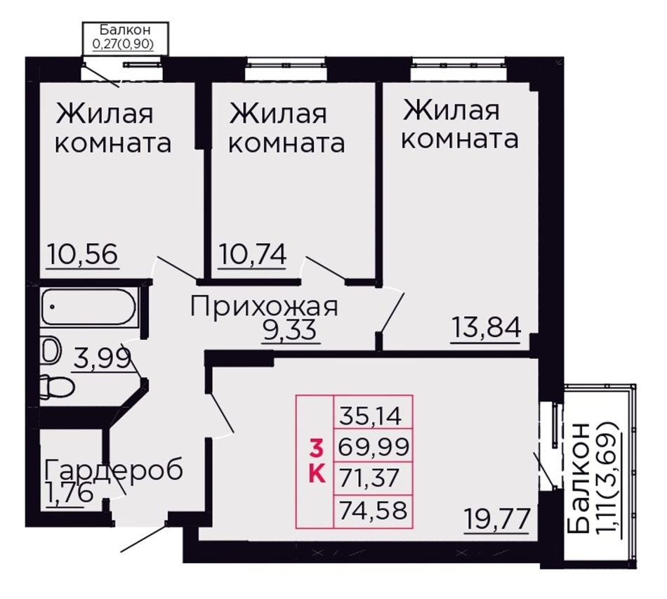 3-комнатная — 71,37 м² 7/9 эт. в Вишнёвый сад