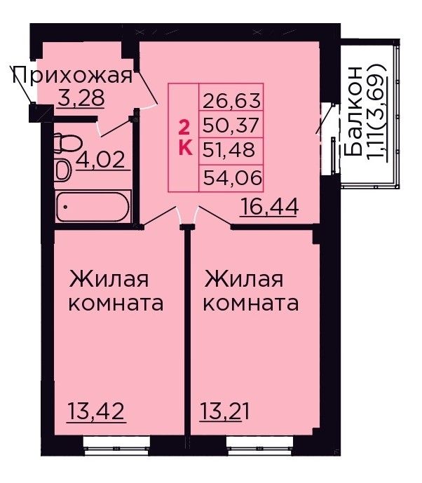 2-комнатная — 51,48 м² 6/9 эт. в Вишнёвый сад