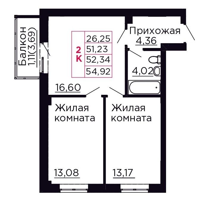2-комнатная — 52,34 м² 8/9 эт. в Вишнёвый сад