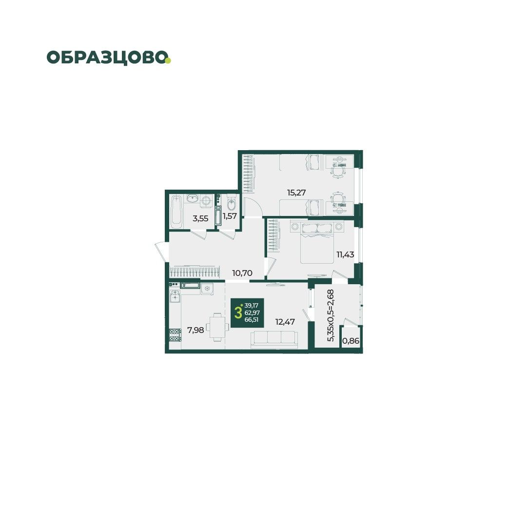 3-комнатная — 66,51 м² 17/18 эт. в Образцово