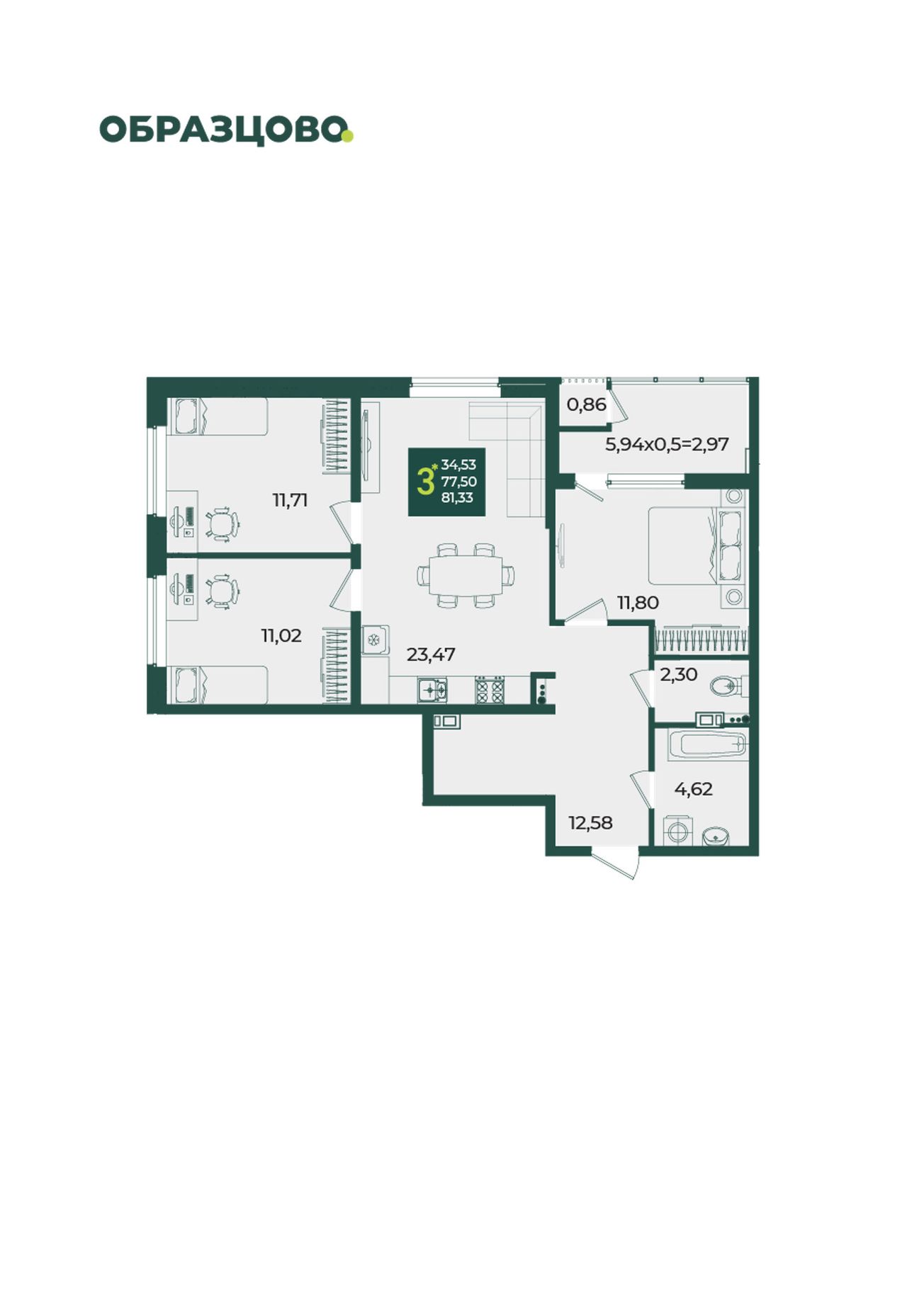 3-комнатная — 81,33 м² 8/18 эт. в Образцово
