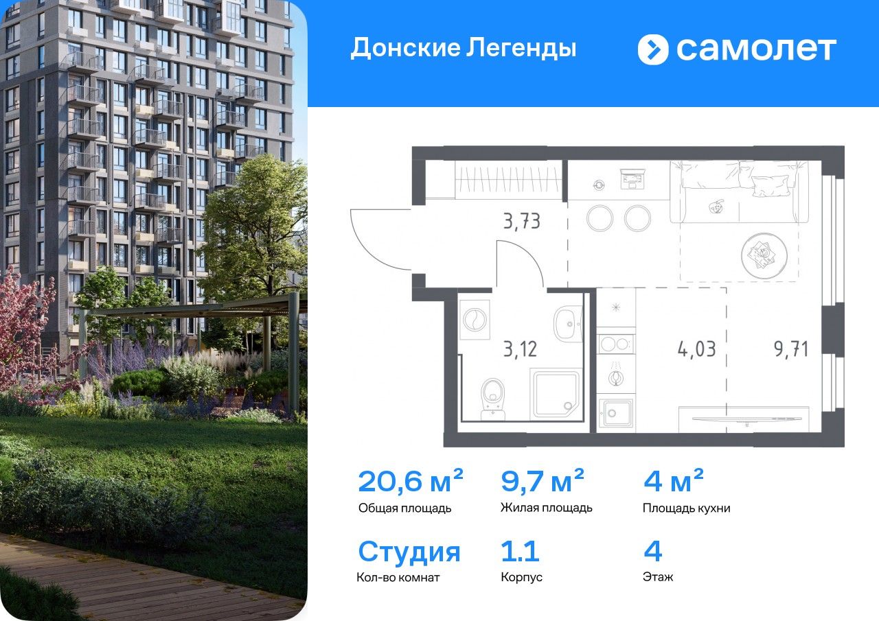 Предлагается квартира студия комфорт-класса 20,59 кв.м в корпусе 1.1 на 4 этаже, в ЖК «Донские Легенды»