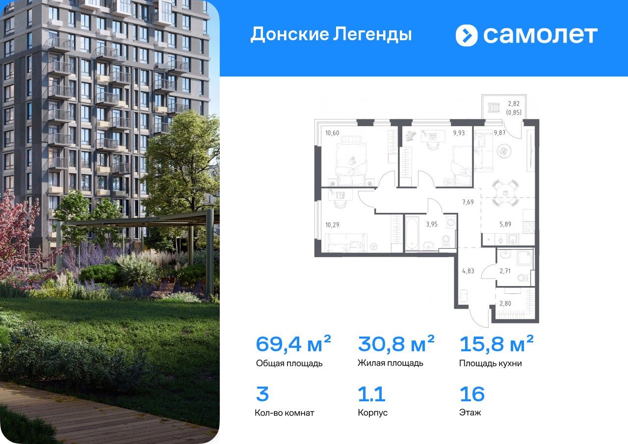 Предлагается 3-комнатная квартира комфорт-класса 69,41 кв.м в корпусе 1.1 на 16 этаже, в ЖК «Донские Легенды»