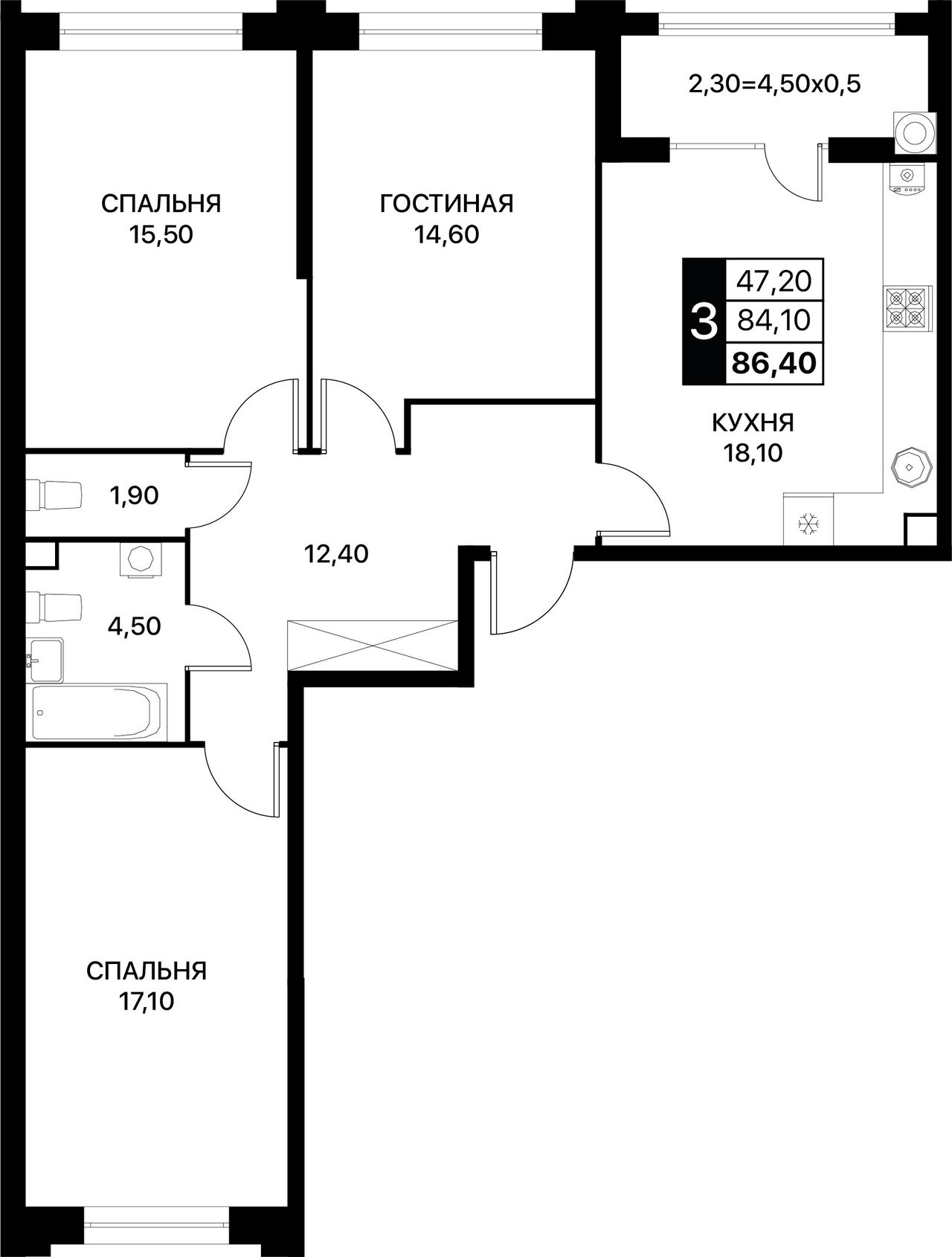 3-комнатная — 86,4 м² 2/12 эт. в Сияние