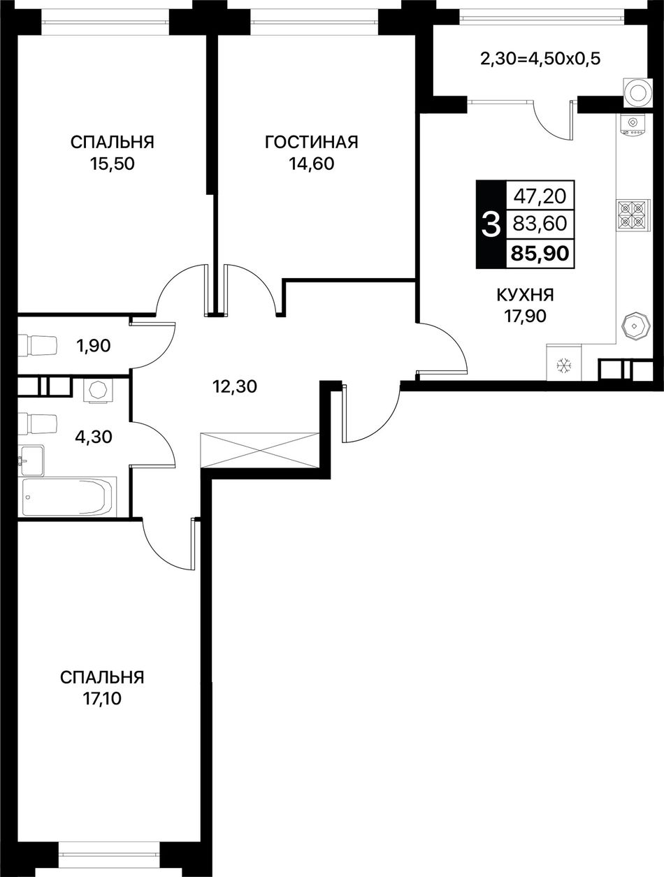 3-комнатная — 85,9 м² 3/12 эт. в Сияние
