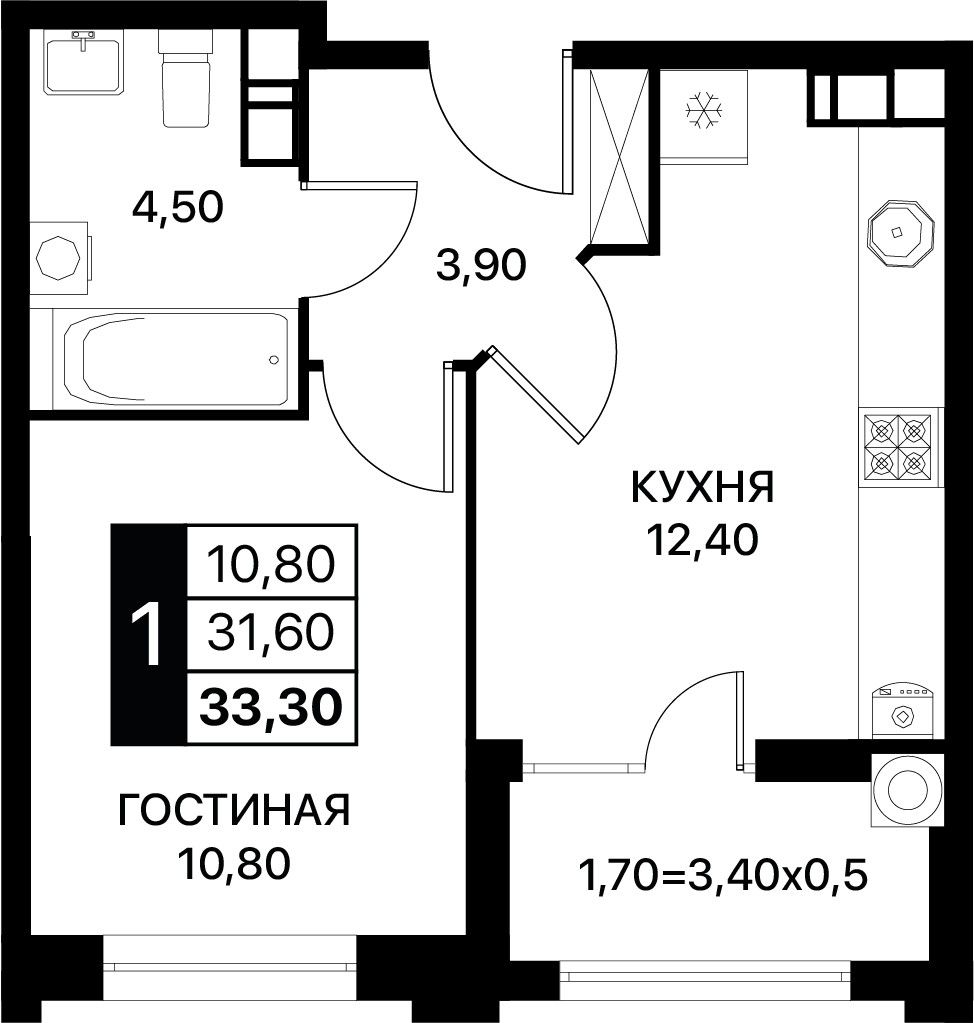 1-комнатная — 33,3 м² 4/12 эт. в Сияние